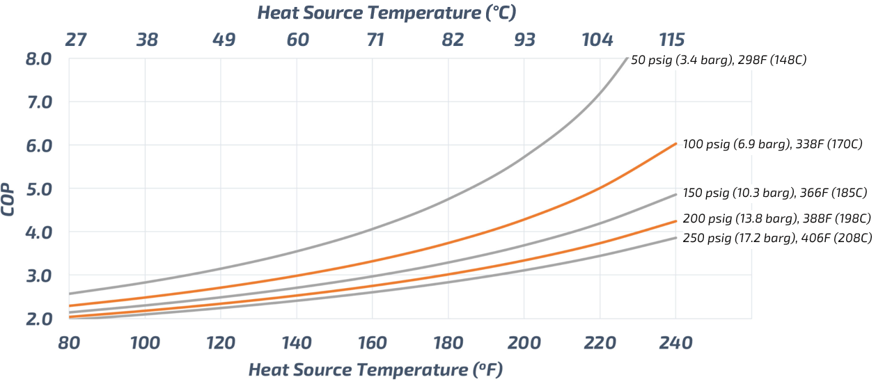 The chart below shows Arcturus COP’s at various heat source temperatures with common steam output pressures and temperatures.